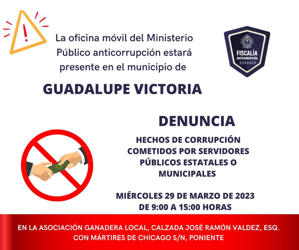 Este miércoles 29 de marzo la Agencia del Ministerio Público se instalará en la Asociación Ganadera Local, ubicada en Calzada José Ramón Valdez esquina con Mártires de Chicago S/N Poniente en el municipio de Guadalupe Victoria, y estará abierta al público de las 9 de la mañana a las 3 de la tarde para recibir denuncias de corrupción.