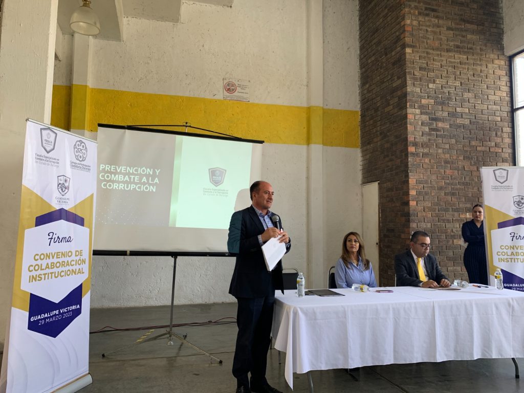 El fiscal especializado en combate a la corrupción, Noel Díaz Rodríguez, la presidente del Consejo de Participación Ciudadana del Sistema Local Anticorrupción, Sandra Díaz Gómez y el alcalde de Guadalupe Victoria, David Ramos Zepeda signaron un convenio de colaboración para llevar a cabo diversas acciones para prevenir y combatir la corrupción.