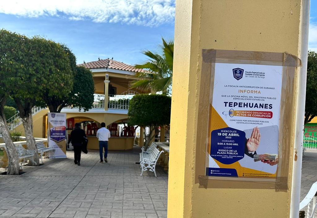 Asimismo, con la finalidad de acercar los servicios de procuración de justicia anticorrupción a los duranguenses de esta zona, se instaló en el kiosco de la plaza principal de Tepehuanes la Oficina Móvil del Ministerio Público especializado, para recibir denuncias ciudadanas de posibles hechos de corrupción y para brindar orientaciones legales a quienes lo solicitaran.